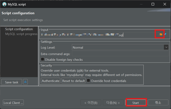 우측 상단 'Input' 영역의 파일 모양 아이콘 클릭하여 덤프 파일 (.sql) 선택 후