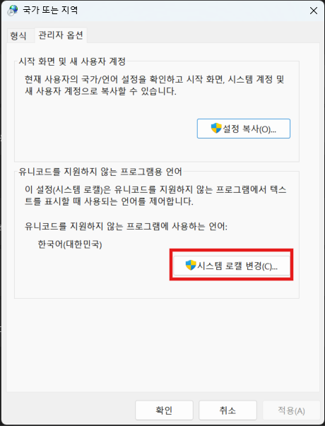 4-1. 국가 또는 지역 > 시스템 로캘 변경(C)