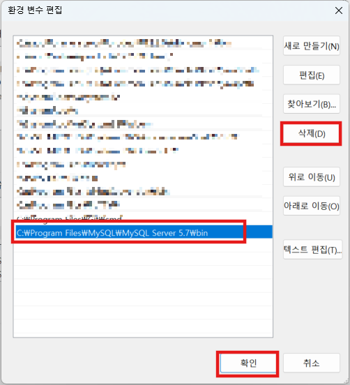 대신 Path 변수에서 MySQL과 관련된 값이 남아 있어 아래와 같이 삭제하였다.