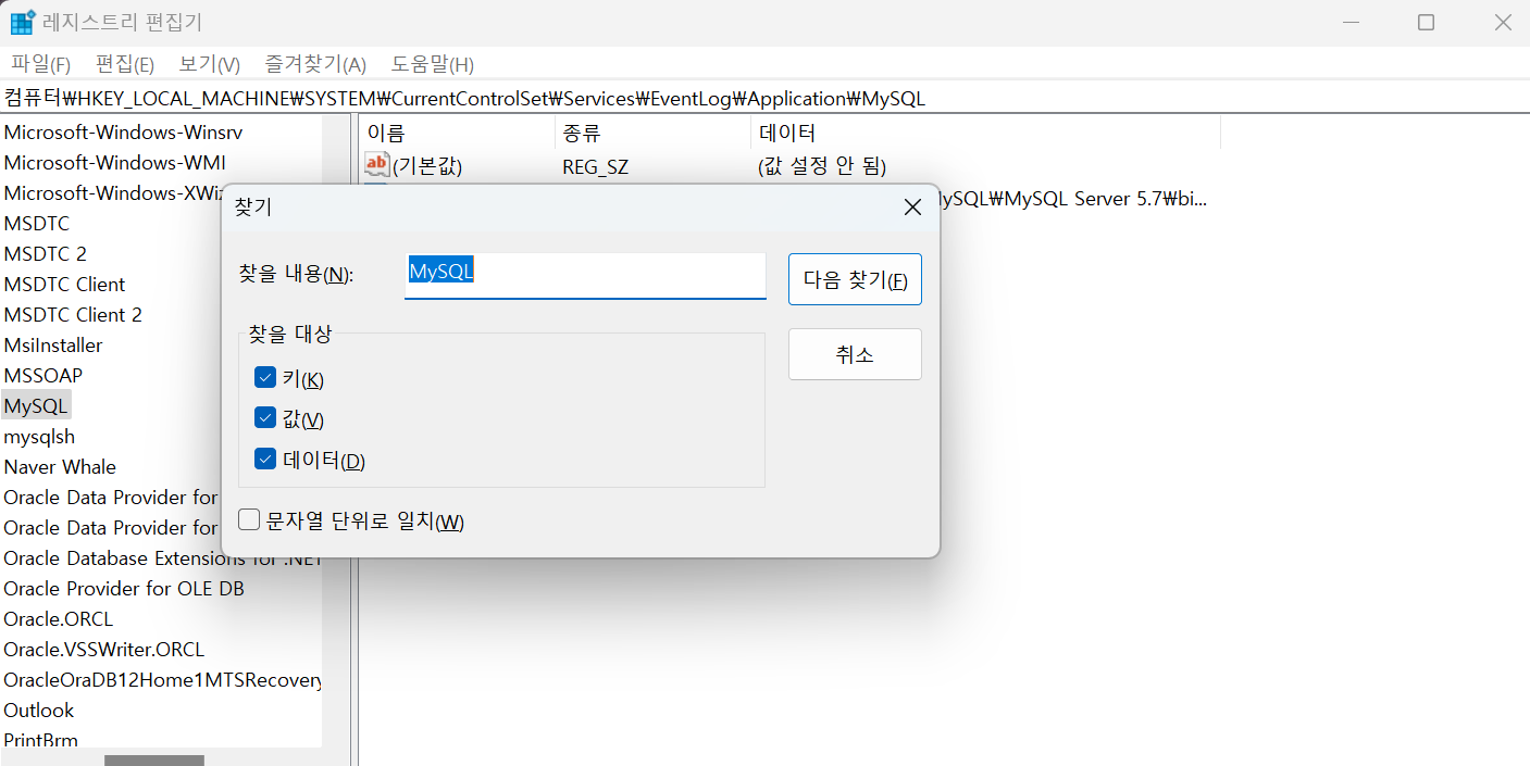 그리고 Ctrl + F를 누른 후 'MySQL'을 입력하여 mysql과 관련한 모든 파일을 찾아 제거한다.