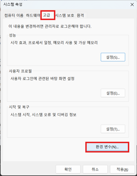이후 고급 > 환경 변수(N)을 클릭하여 환경 변수 창을 실행한다.