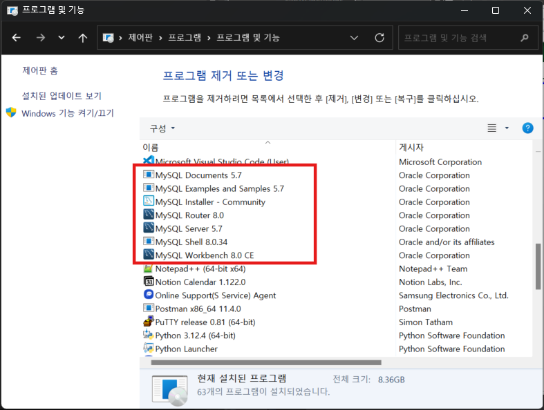 제어판에 있는 MySQL 관련 프로그램들을 모두 삭제한다.