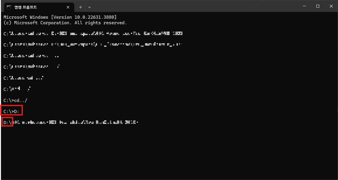 위 코드를 입력하고 Enter를 입력하면 D 드라이브로 경로가 바뀌는 매직