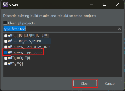 2) 클린할 프로젝트 체크 후 Clean