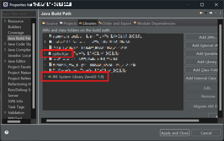 1) ojdbc14.jar, ojdbc6.jar 모두 제거하고 ojdbc8.jar 드라이버만 추가시킨다.