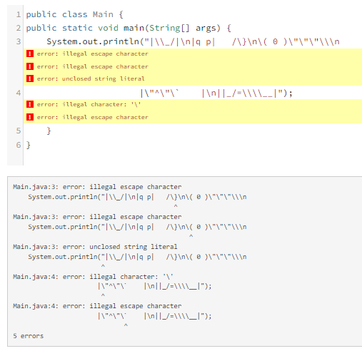 System.out.println(|\\_/|\n|q p| /\}\n\( 0 )\"\"\"\\\n