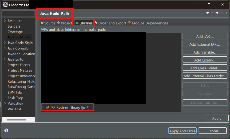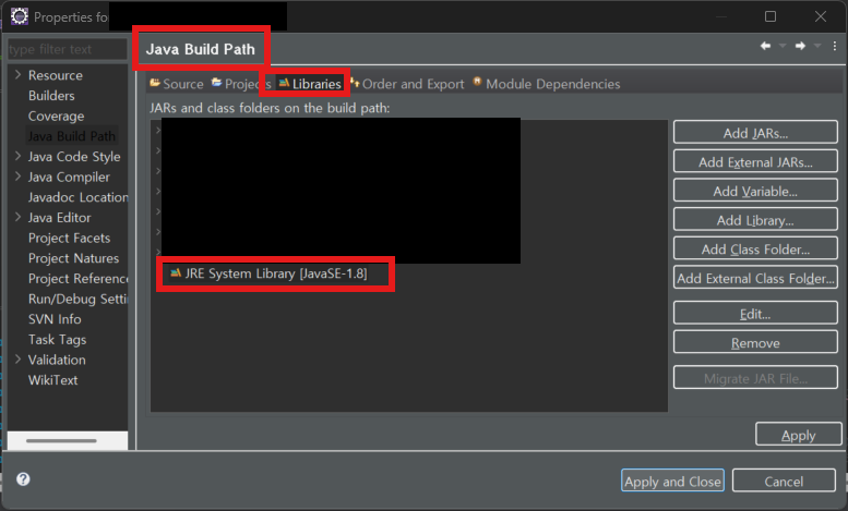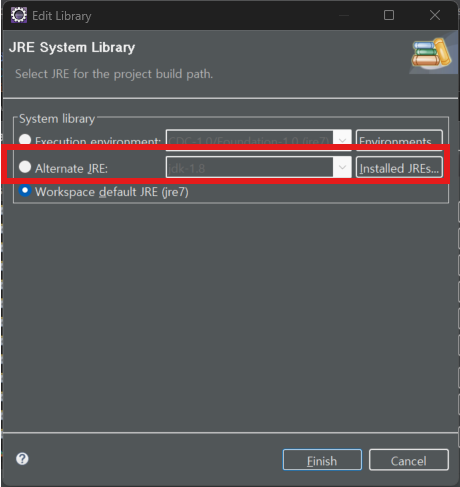 Java Build Path > Libraries > JRE System Library 클릭 > 우측 Edit 클릭
