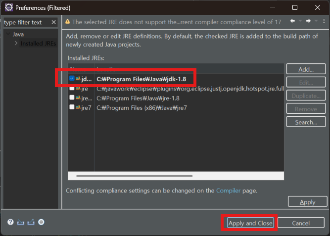 jdk-1.8 버전 선택 > Apply and Close