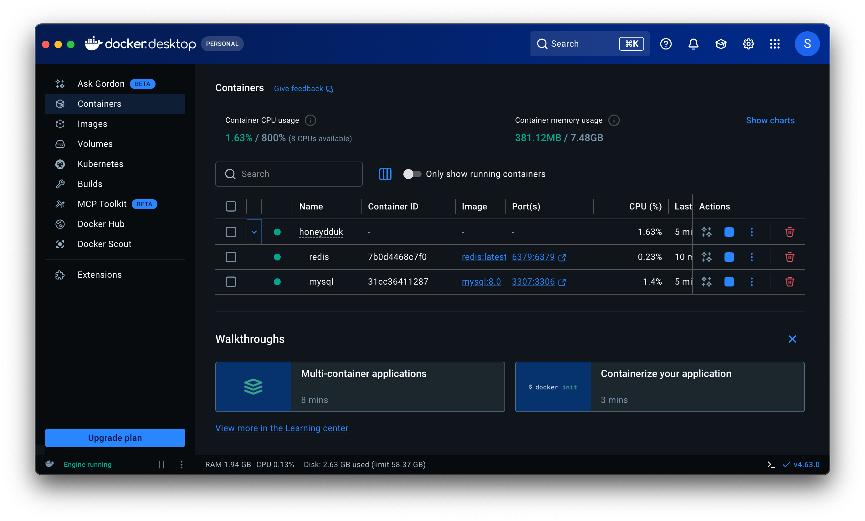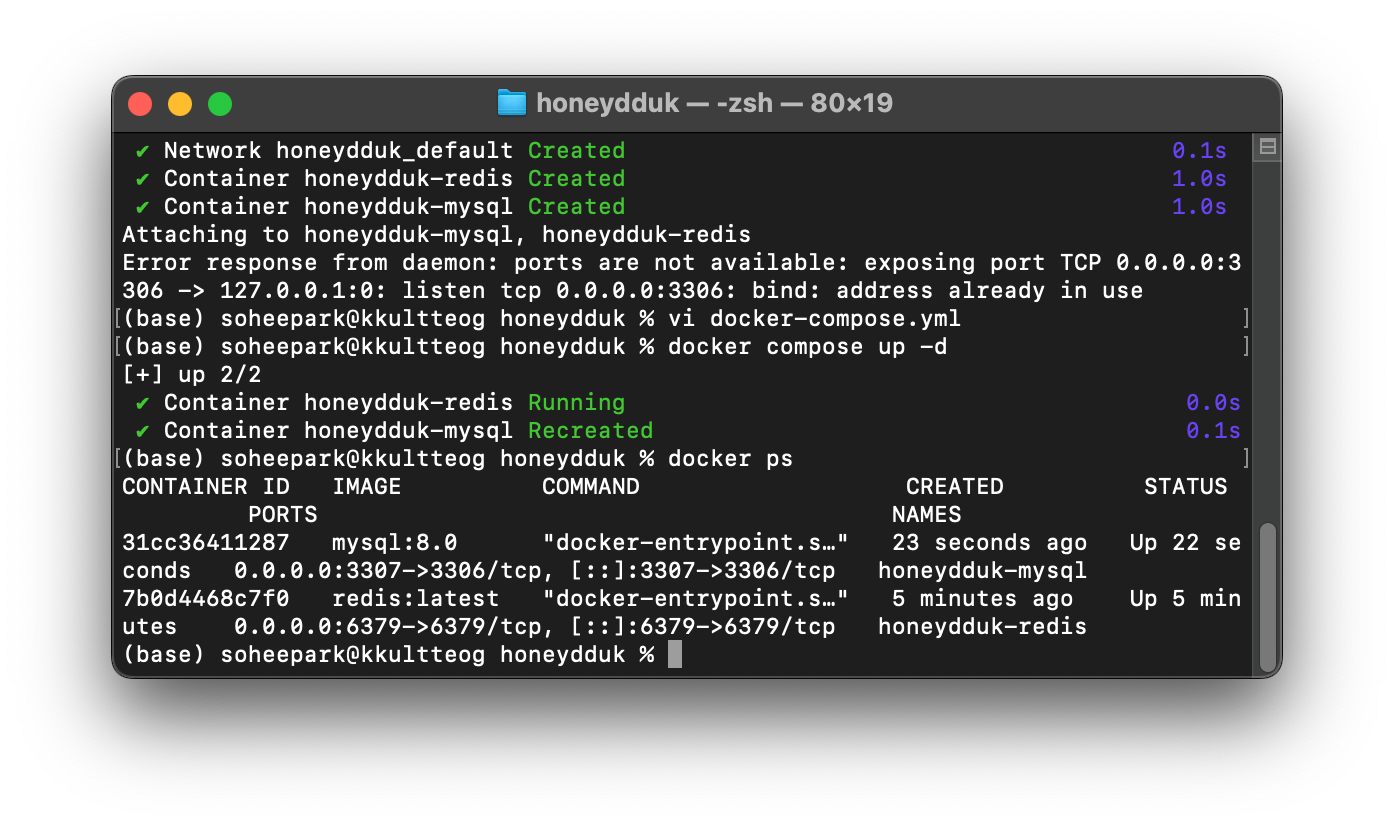 우선 아래와 같이 MySQL 8.0, Redis를 docker 안에 구축하였다.