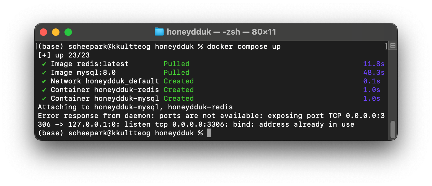 * MySQL 3306 포트는 이미 로컬 컴퓨터에 설치한 이력이 있어 현재 백그라운드에서 돌아가고 있는 듯 하다.
